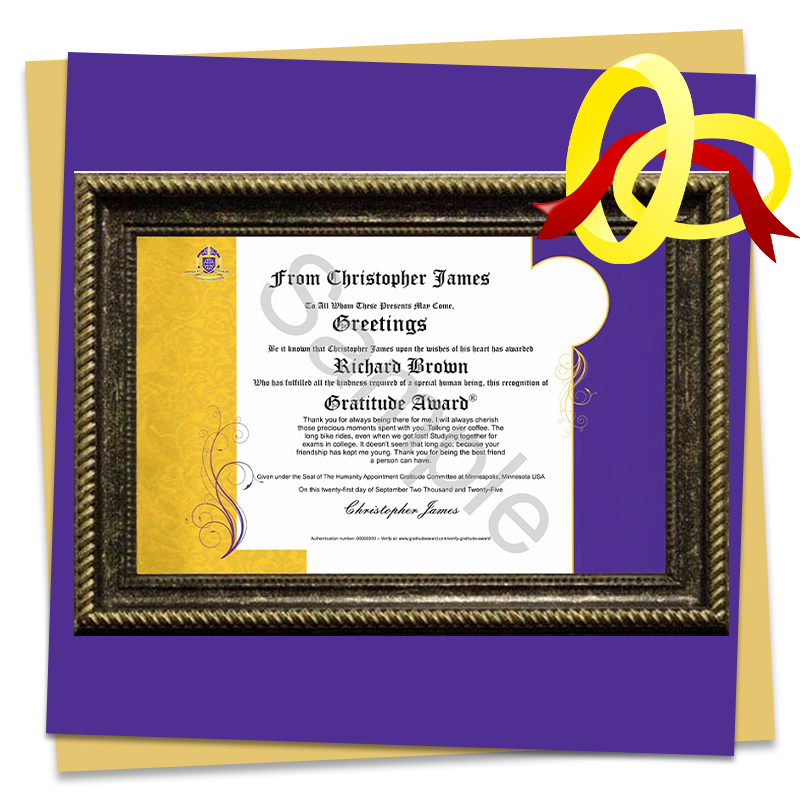 At the time of issue, your GRATITUDE AWARD authenticity is attested to by the Humanity Appointment organization’s Gratitude Award committee, issued a serial number, archived permanently for authenticity verification, and shipped directly to the recipient or issuer.