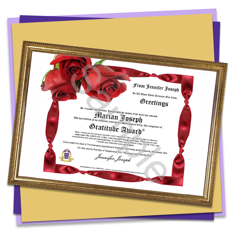 Based on the writings of John Amodeo, we can say that the GRATITUDE AWARD® signifies the giving of gratitude, meaning extending attention beyond yourself to observe what someone has given or done for you. By giving GRATITUDE AWARD®, you open your eyes to the existence of the person who lifted you up. Then, simultaneously, you notice how their eyes open to recognize your existence as distinct from theirs. You were positively affected by what they did for you or with you. At that moment, they saw you, appreciated you, cared about you, and perhaps even loved you. By giving them the GRATITUDE AWARD, you express your gratitude for their generous outreach beyond themselves and into your world. In giving such a person the GRATITUDE AWARD, you are publicly declaring to the world that he or she has fulfilled in your life all that is expected of a special human being.